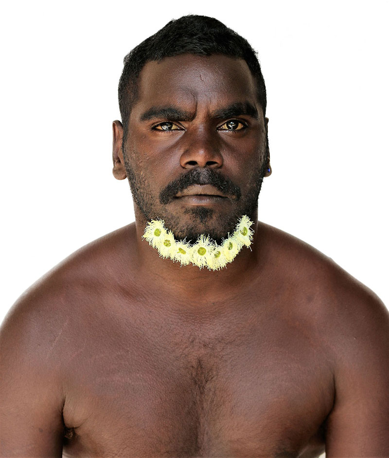 Each on a field of black or white, the men and their adornments glow. Flowers local to the Coen area are carefully positioned in the men’s facial hair, and on top of the heads of the young boys, signalling prosperity, life and beauty. While these floral arrangements show a nurturing side, they are also a clear reference of cultural identity. Adorning a beard with flowers is an acknowledgement of a ‘cult hero’, who is known among the locals of Coen, amplifying the narrative of a warrior without a weapon.