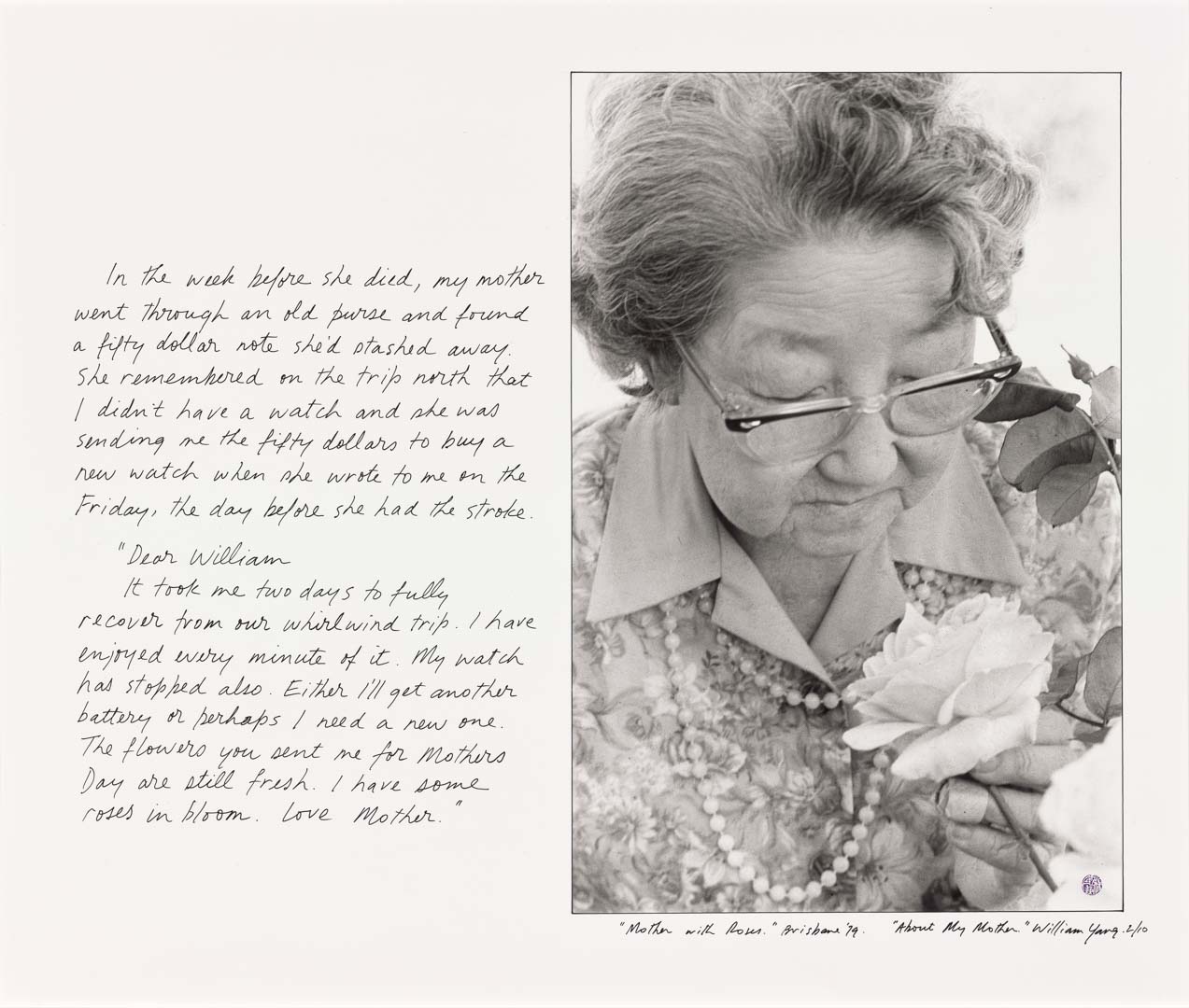 William Yang / Australia b.1943 / “Mother with roses.” Brisbane ’79. (from ‘About my mother’ portfolio) 2003 / Gelatin silver photograph on paper / 51.3 x 61.1cm (comp.) / Purchased 2004. Queensland Art Gallery Foundation Grant / Collection: Queensland Art Gallery | Gallery of Modern Art / © William Yang