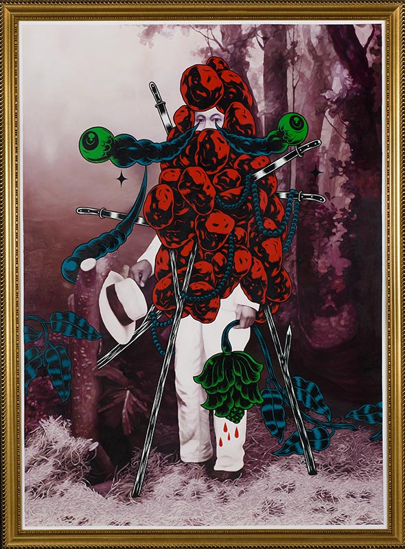 In bold and stylised reworkings of historical images, Riyadi constructs alternate renderings of the past. His reinterpretations of the middle-class photographic portraits common in the Sukarno-led independence era of the 1950s and 60s — which Riyadi finds in Yogyakarta flea markets — bear sinister marks. While the figures’ anonymity and unassuming poses seem peaceful enough, Riyadi’s addition of grotesque and demonic cartoons in these paintings points to the undercurrents of violence and corruption that have affected Indonesia through its volatile past.