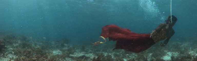 Martha Atienza’s video work in APT9, Our Islands 11°16’58.4”N 123°45’07.0”E 2017 recreates an annual event in the artist’s hometown. For the Ati-Atihan festival in Madridejos, the men wear elaborate and often humorous costumes, which they create themselves and change every year in response to current events. Atienza and the actors spent months practising and planning the filming of the underwater parade, in which some of the men float past the cameras gracefully, while others trample the dying coral. Projected onto plexiglass, the work immerses the viewer in a silent and mesmerising experience where the subjects appear to exist in real time on the other side of the screen.