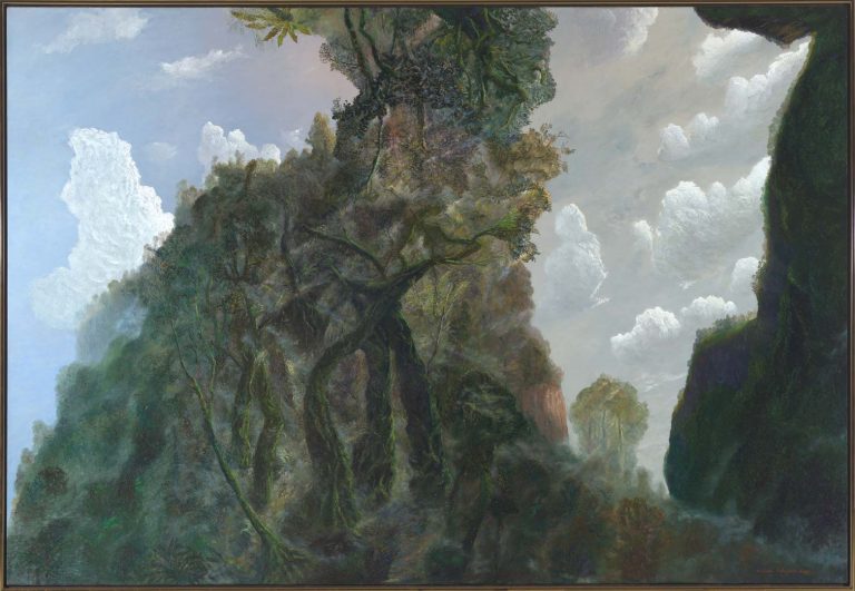 Throughout his well-established artistic career, William Robinson’s stylistic development reflects shifts from one home environment to another. From a small, haphazard suburban farm at Birkdale, to the dense Gold Coast hinterland rainforest, to the beachside town of Kingscliff, Robinson has continued to depict his own ‘backyard’. This monumental rainforest landscape represents the landscape at Beechmont where his studio was situated, depicting it as an entangled, mysterious environment, viewed dramatically from below. Primordial forest forms rise centrally amid accompanying clouds and, while this is clearly an antipodean environment, the work has echoes of the European sublime landscape tradition.