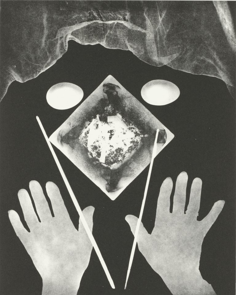 Man Ray’s main photographic achievement was the Rayograph, a technique (also known as a ‘photogram’) for rendering a three-dimensional abstract world in a photographic print. It is this process that has been translated into lithographic form in Untitled 1966. Here, the original photogram (from the 1920s) employed objects on light-sensitive paper without a camera. The lithograph was made during Ray’s lifetime, in collaboration with master printers at Gemini GEL.