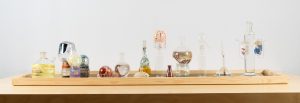 ‘This work, Elective affinities, includes images from art history that mirror the act of creation. The laboratory vessels make the relationship between matter, meaning and painting explicit. Some are monochromes, others contain techniques of dripping, pouring or even blowing. They embody gesture and the passage of time across their glass. Together, they point to the fact that paintings aren’t hermetically sealed objects, they are part of a network and their agency is distorted and magnified by their visibility.’ — Madeleine Kelly